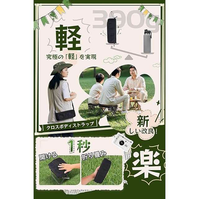 【便利で軽量なデザイン】この折りたたみ椅子 コンパクトの重さはわずか390gで、水筒よりも軽いです。フレームは7075アルミニウム合金製で、超軽量で120KGまで耐えられます。折りたたみ傘のようにコンパクトで使いやすいです。この折りたたみ椅子 アウトドアの収納サイズはわずか28×11cmで、持ち運びに便利です。折りたたみ椅子 軽量 持ち運びは軽量で持ち運びやすく、アウトドア活動向けに設計されています。アップグレード版には、ハイキングの際の持ち運びに便利な新しい取り外し可能なショルダーストラップが装備されています。脚チューブは特殊な技術を採用し、表面保護が強化され、耐久性、耐水性、耐光性が大幅に向上しています。