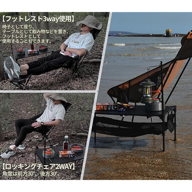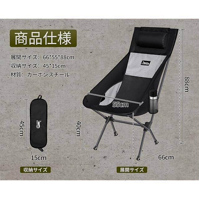 【優れる耐久性と通気性】 アウトドア椅子は800Dポリエステルを採用した座面とメッシュの設計で、あつい季節も蒸し暑くなく、抜群の通気性と快適な座り心地を確保できます。座面の裏も防水加工し、雨でもタオルでちょっと拭くだけ座れます。さらに、座面を深くするし、ハンモックのように体にフィットし、ゆったりと包み込まれる座り心地を実現したレジャーチェアです。