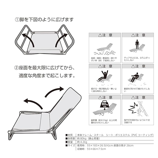 サイズ(約):1830x550x265mm 座面の高さ260mm 収納時660x550x75mm