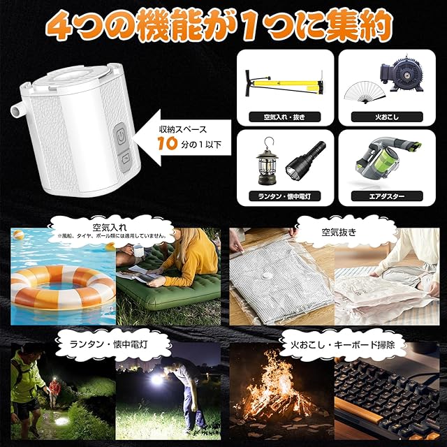 【強力な空気入れと空気抜き】コンパクトだけど風密度200L/分と強力で、4kpaの空気入れる圧力と空気抜く圧力により、エアマットレスを素早く空気入れることができます。 キャンプ、アウトドアでこれがあれば準備が楽ちんです。また、完璧な家庭旅行用品です。は迅速に圧縮袋の空気を抜いて、収納スペースを50%以上節約できます。アウトドア用品や衣類を保管するために多くの時間とスペースを節約できます。