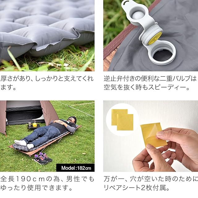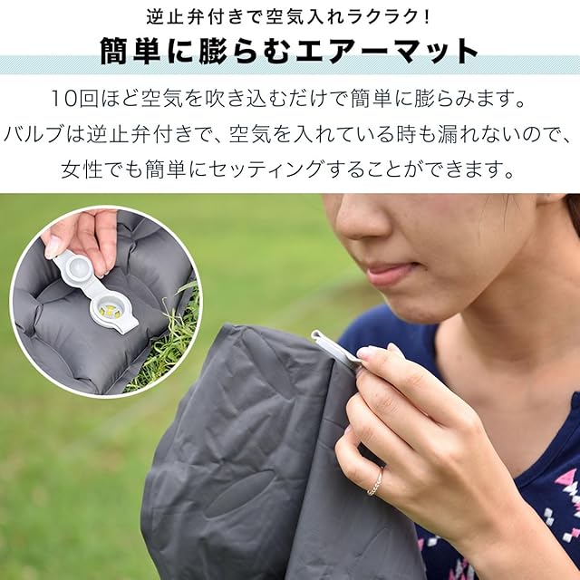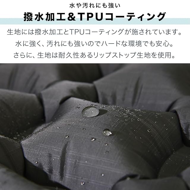 ✅【撥水加工&TPUコーティング】 生地には撥水加工とTPUコーティングが施されています。水に強く、汚れにも強いのでハードな環境でも安心。さらに、生地は耐久性あるリップストップ生地を使用。 ✅【簡単に膨らむエアーマット】 10回ほど空気を吹き込むだけで簡単に膨らみます。バルブは逆止弁付きで、空気を入れている時も漏れないので、女性でも簡単にセッティングすることができます。