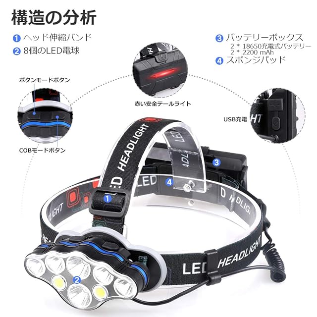 商品名:Miotsukus ヘッドライト 8LEDヘッドランプ usb充電式 18000ルーメン 高輝度ヘッドライト 赤&白SOS点滅 8種モード 防水 作業 登山 釣り停電 地震 非常時 災害 アウトドア 日本語説明書付
