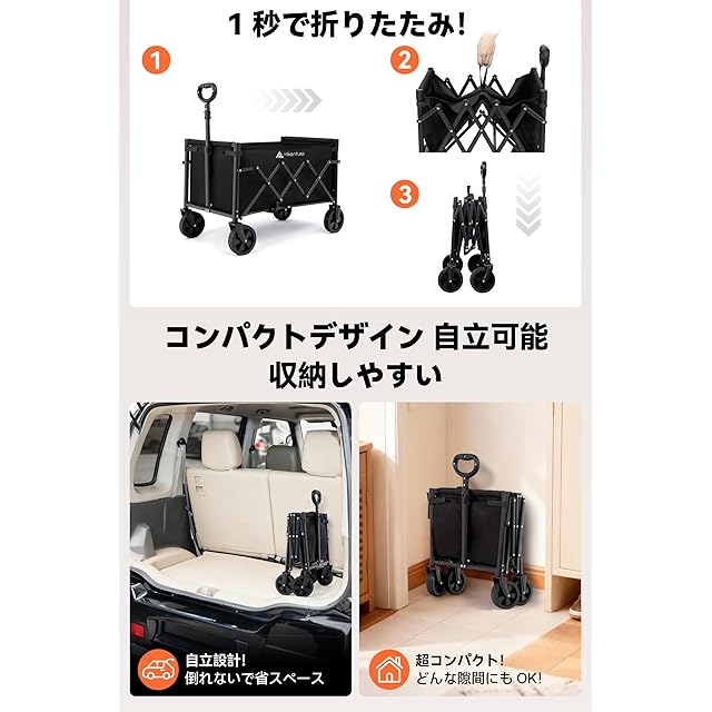 Hikenture キャリーワゴン 【2025新登場】 自立収納 アウトドアワゴン ミニ 超軽量4.7kg 大容量 100kg高耐荷重 子供乗せれる キャンプ カート ワンタッチ展開&収納 持ち運び便利 コンパクト キャリーカート 頑丈スチール制 多地形対応 ワイドタイヤ搭載 アウトドア・荷物運び・買い物・釣り・イベント・引っ越し・ゴミ出し