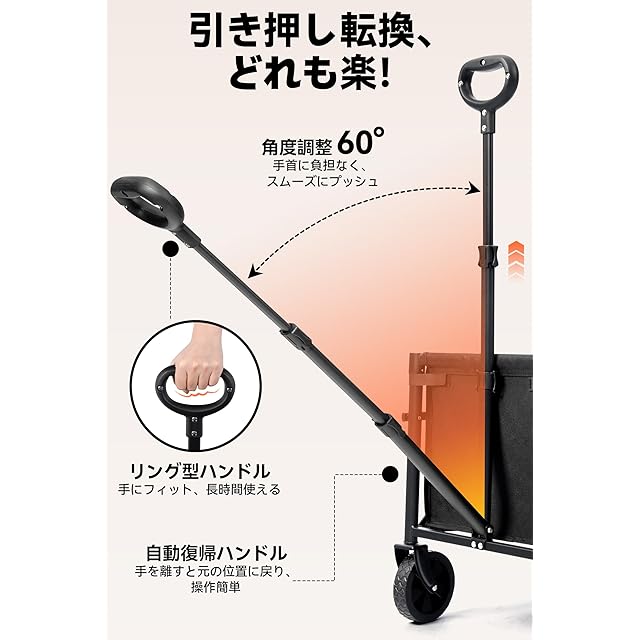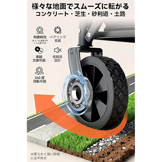 「360°回転キャスター・自動復帰ハンドル」 360度回転する前輪とスムーズなベアリングにより、操作が非常に簡単で、エレベーターや狭い通路でも軽快に移動できます。タイヤは幅3cm、直径12cmで安定した走行をサポート。さらに、多角度調節可能なハンドルにより、最適なポジションで快適に使用できます。自動復帰機能付きで、運搬時の操作性と快適性を大幅に向上させます。