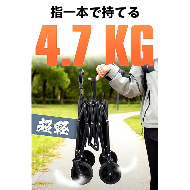 「超軽量・コンパクト」 本アウトドアワゴンは底板一体型デザインで、押し開くだけのワンタッチ操作で簡単にセットできます。重量は4.7kgと軽量で、従来の重いタイプとは異なり、女性一人でも簡単に使えます。驚くべき携帯性を実現し、使いやすさを考慮した設計。取り外し可能な車輪でさらにコンパクトに収納可能です。