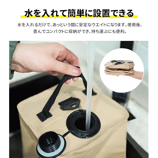 【水を入れるだけ 簡単注水タイプ】持ち運びしやすい注水式マルチウエイトです。畳んで収納し、現地で広げて水を入れて使うことができます。