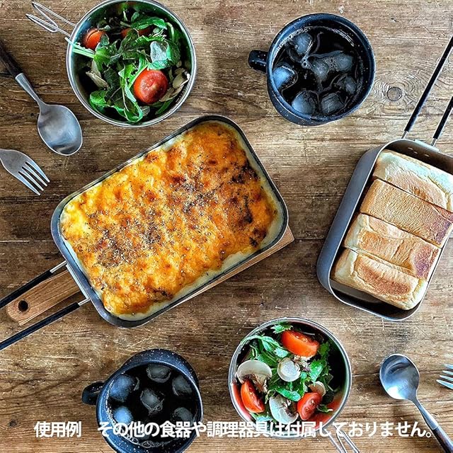 【MR-750 Proバーナーや焚き火でも炊きやすい大容量クッカー】約4.0合まで炊けるラージサイズの角形飯盒です。使い方は飯盒と変わらず、ご飯もふっくら炊きあがります。バーナーでも焚き火でも炊飯が可能です。もしライスクッカーに対して火が小さい場合は、バーナーパッドをのせると安定し安全です。 また、角型だと食材を寝かせたり並べたりして調理できるので、ソーセージや魚の調理にも向いています。フライパンに近い使用感なので、アウトドア料理に慣れていない方も扱いやすいのでおすすめです。サイズ:ラージメスティン本体/19.3x13.3x7.3㎝ 重量:約285g 容量:1580ml 炊飯量:約3~4合