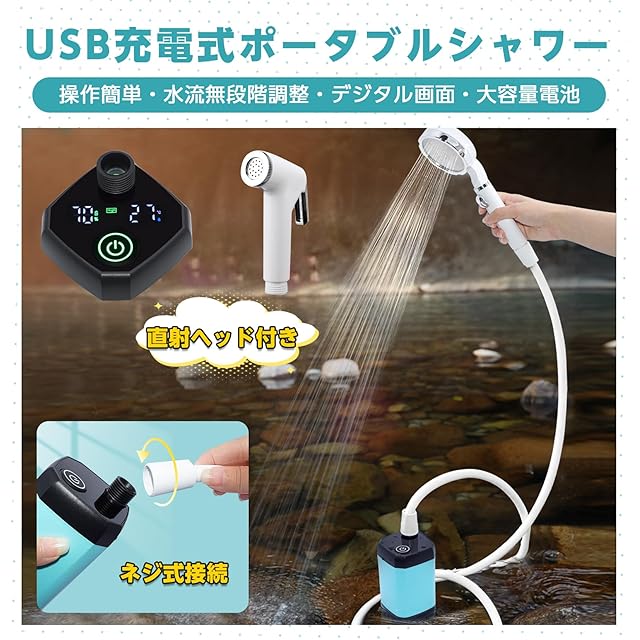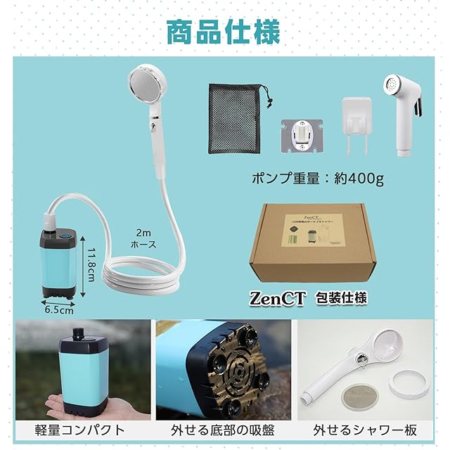 商品名:ZenCT ポータブルシャワー アウトドア USB充電式 6000mAh 【直射ヘッド付き】電動 簡易シャワー キャンプ 水流量無段階調節 Type-C充電 釣り 海水浴 サーフィン 旅行 水遣り 洗車 屋内 屋外 コンパクト ペット浴 節水 防災 植物潅水 軽量 CT201