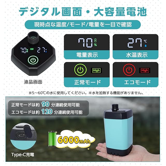 【コードレスUSB A-C充電式】他の携帯シャワーとは異なり、このポータブルシャワーはポンプと電源を1つにまとめ、スペースを節約するだけでなく、防水性能も向上させます。6000mAh大容量バッテリーが内蔵され、一回のフル充電で 正常モードは約90分連続使用可能、エコモードは約120分連続使用可能です。5V2AのUSBソケットを搭載するパソコン、モバイルバッテリー、ACコンセントに差し込むだけで充電できます。繰り返し使用できるUSB充電式は、乾電池を使用しなく、環境にやさしくて省エネです。【※水を加熱できません※】