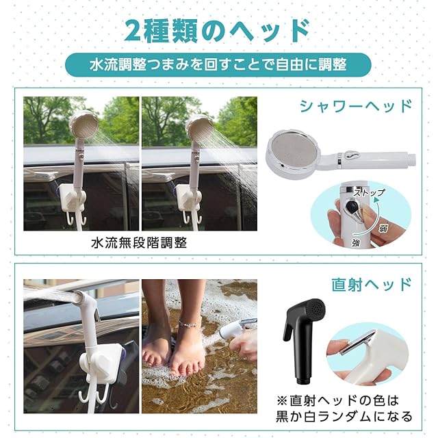 【直射ヘッド・2つホルダー】付属品の2つのホルダーを使って、用途によってシャワーを壁や車のボディーなどに取り付けて使用し、両手を解放します。さらに、交換可能な直射シャワーヘッドがついていて、室内/室外でのシャワー、ペット浴、洗車、ガーデンへの水遣り、旅行とキャンプに幅広く適用します。※直射シャワーヘッドはおまけとして付属し、その色は黒か白のどちらかがランダムに決まります。