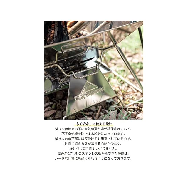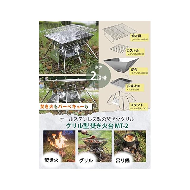 特徴:オールステンレス製で錆びにくく長寿命。すべての素材がステンレスで、網の上で簡単な料理ができるほど丈夫!