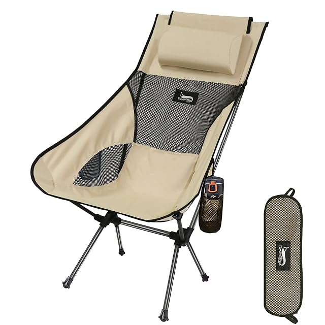 DesertFox アウトドアチェア 折りたたみ 枕付き 超軽量 【独自開発のカップホルダー】 【耐荷重150kg】 キャンプ椅子 コンパクト イス ハイバック 椅子 収納袋付属 お釣り 登山 携帯便利 0066 (クリーム,Large)