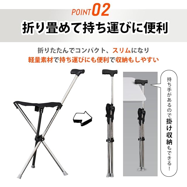 この折りたたみ式の杖は、軽量で持ち運びに便利です。アルミニウム製の頑丈な構造で、安定性に優れています。座面付きなので、外出時に腰を休めることができます。コンパクトに収納でき、旅行や散歩にも最適です。手すりやベンチがない場所でも、この杖があれば安心して歩行できます。