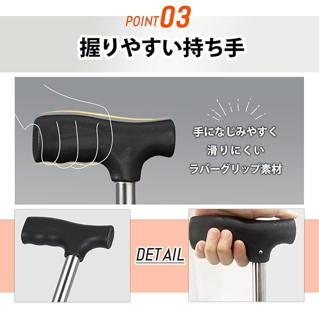 ✅滑り止めグリップ: 杖の先端と手元のグリップには滑り止め加工が施されており、安全にお使いいただけます。