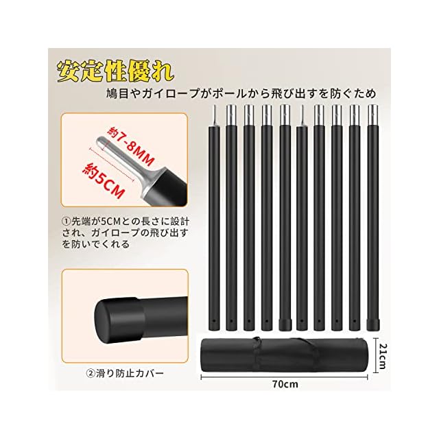 【組立簡単+ 収納袋付】接地部分には滑り防止用ラバーカバー付きで、滑りにくく、耐摩耗性に強いゴムキャップがかぶせられていて、ポールの組み立ての安定性をを高めます、実用的で安全です。先端にはロープ抜け防止用のローレット加工が施されています。ポールをコンパクトにまとめて収納できる収納バッグには、家での保管や持ち運びにとても便利です。