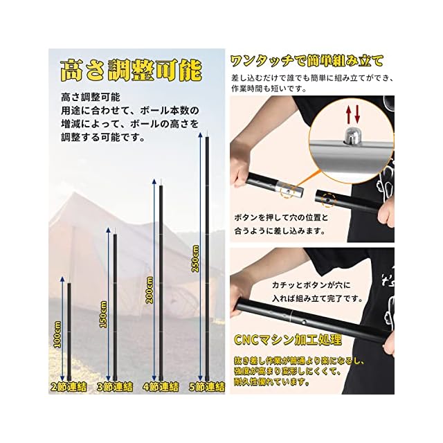 【分割式構造の5節連結】1節の長さは約50cm、-1本ポールの重さは約1.1kg;スペースをとらずに収納やすい、長さ調節が可能で、お手持ちのテントに合わせて最大250cmまで調節することができます。ポールは差し込むだけのワンタッチ接続なので、どなたでも簡単に組み立てができて作業時間を短縮できます。男女を問わず、数秒で簡単に取り付け/取り外しができます。