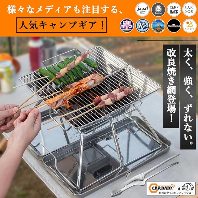【商品仕様】 本体と焼き網の材質:ステンレス、収納サイズ:39×22.2×5.5cm、展開サイズ:39×38.5×22cm、焼き網面積:30×30cm、およそ2~4人ぐらいのファミリーやグループでBBQするには丁度良いサイズです。