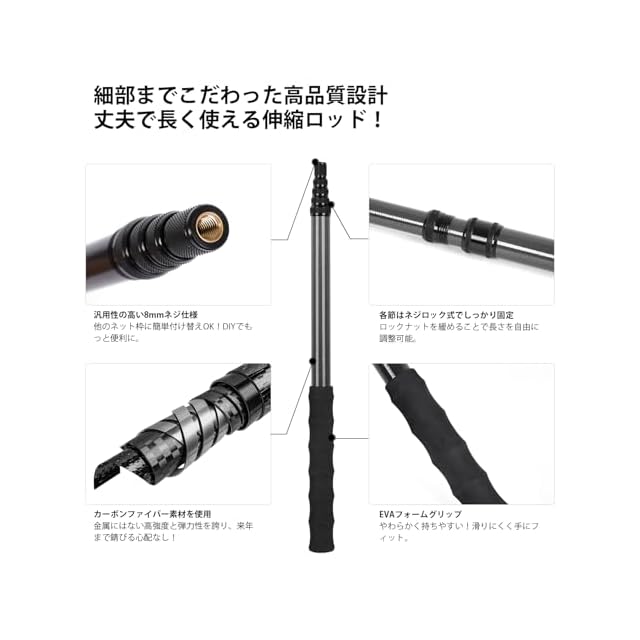 【製品素材】ポール:カーボンファイバー。ネット:アルミ合金、ナイロン。ハンドル:EVA。その他の金属部品:アルミ合金。
