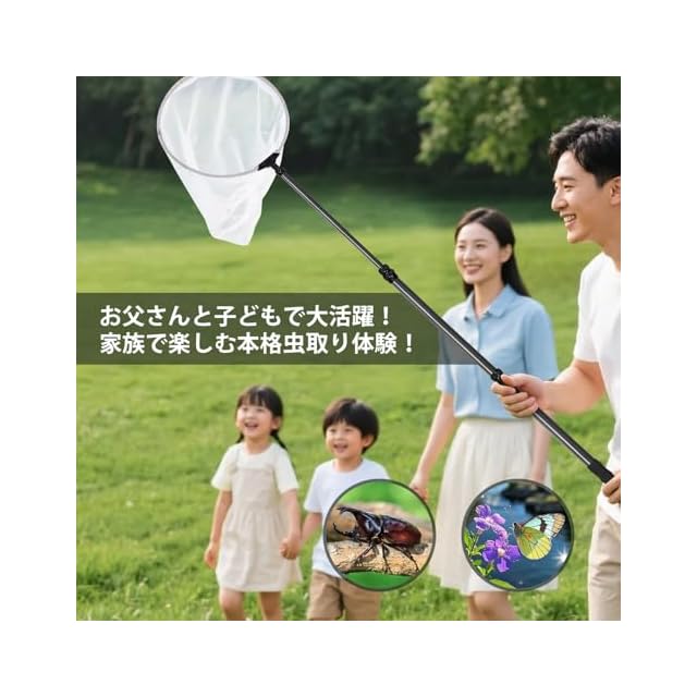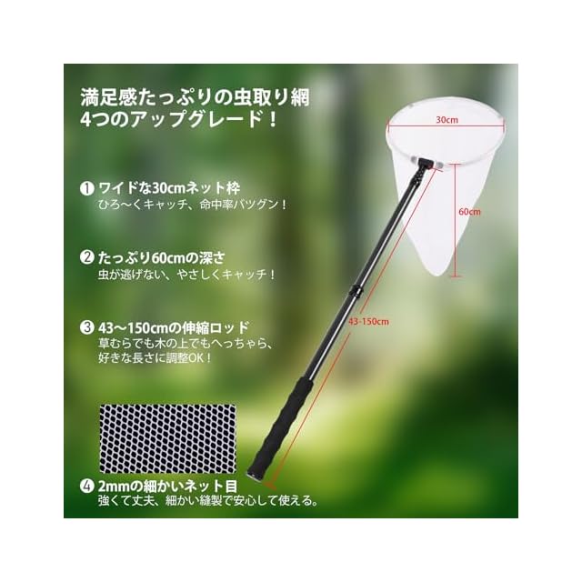 【直径30cmのワイドネット】プロ仕様虫取り網は直径30cmの大きめフレームで、広範囲の虫を効率よくキャッチ。通気性の良いメッシュ素材を使用し、メッシュの大きさは2mmで、虫をしっかりと捕まえることができます。