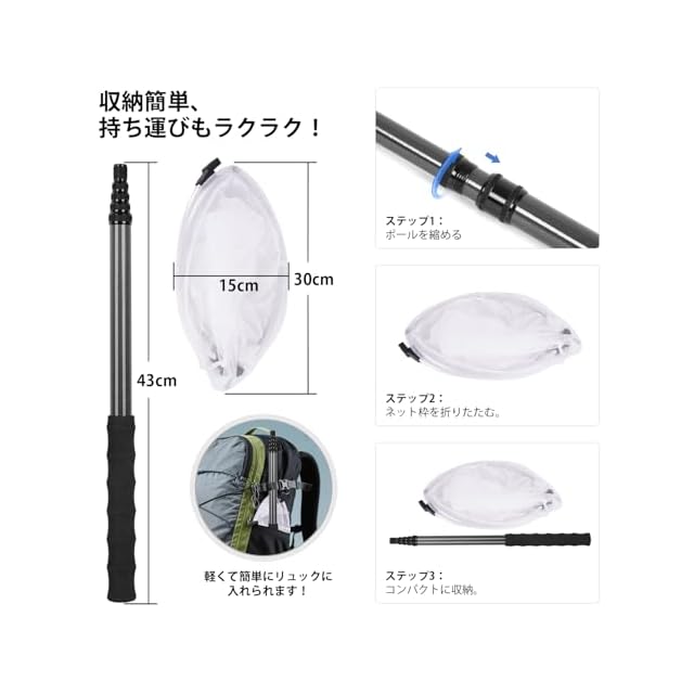 【簡単収納&コンパクト設計】むしとりあみは使わないときは縮めてコンパクトに収納可能。ポールとネットヘッドは取り外し可能で、ポールを縮めるとわずか42cmになります。折りたたんだ後は、バックパックやリュックに簡単に収納でき、キャンプ、釣り、登山などのアウトドア活動に最適です。