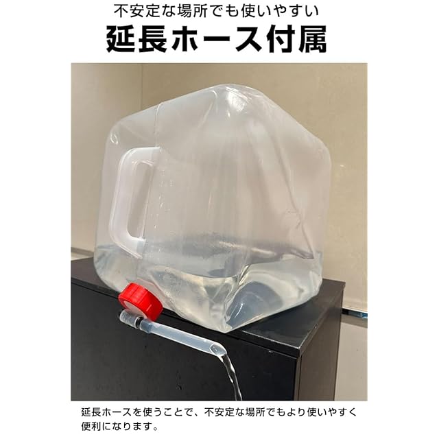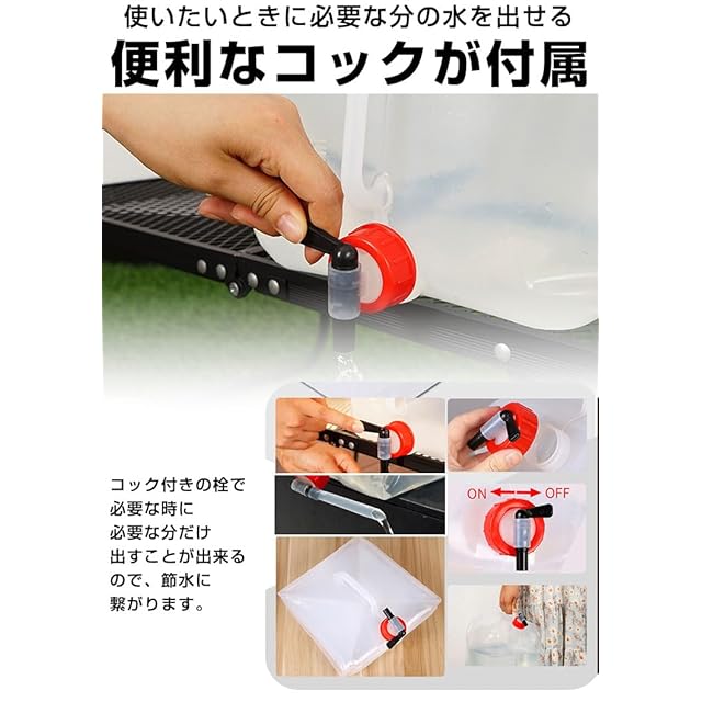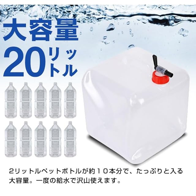 アウトドアシーンはもちろんのこと、 普段のお出かけなどでも水があると便利な シーンは沢山あります。いざという時の 防災アイテムとしても重宝しますので、 是非とも1つ持って置きたい所ですね。 ※飲料水用の水タンクとしては使用しないで下さい。