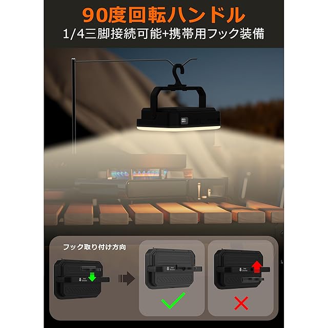 タフで多様な設置方法: IP65等級 の防塵・防滴構造で、雨やほこり、衝撃にも強い。 三脚 に取り付けたりと、様々な場所で自由に設置可能。アウトドアはもちろん、防災備蓄、作業灯、ガレージなど幅広い用途に。