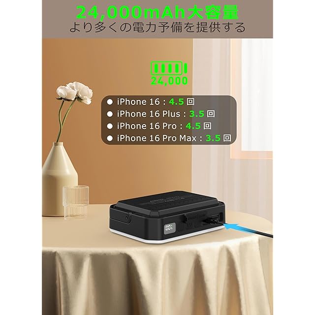 スマホも高速充電 & 超長持ち照明: 24,000mAhの大容量バッテリー に QC3.0搭載 で最大 22.5W出力。アウトドアや緊急時にスマートフォンの 急速充電 が可能。照明は 最大1800ルーメン から 最小20ルーメン まで調光でき、最長 300時間 の連続点灯を実現。