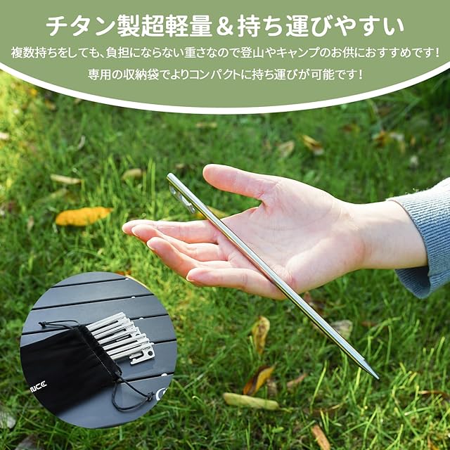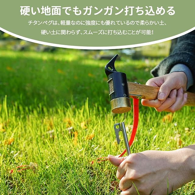 【超高強度チタンペグ】チタンペグは、どんな硬い地面でもガンガン打ち込める強度は抜群です。鍛造ペグに負けない強度を持ちながら重さはその半分から3分の1にもなります。