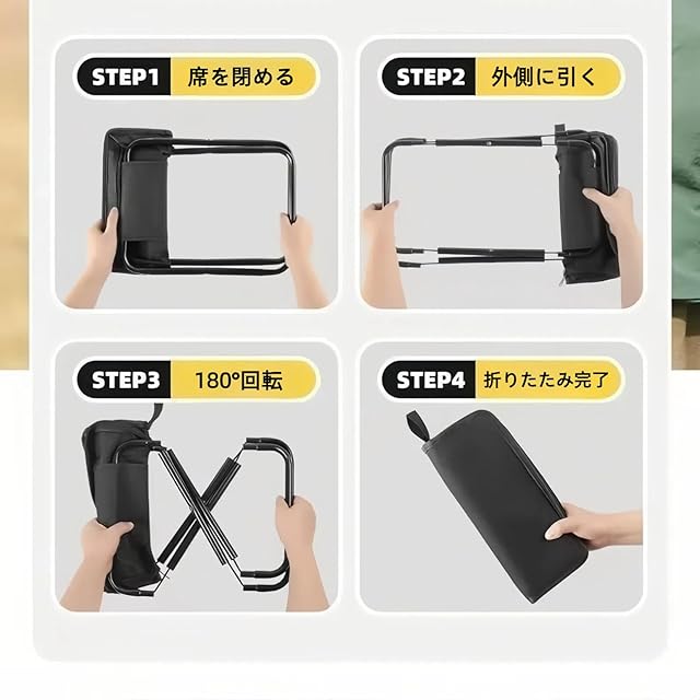 スムーズな折り畳み収納(コンパクト折りたたみ椅子):折りたたみ椅子・折り畳み椅子の本領発揮!収納は、椅子を畳んだ後、ストレッチ部分を広げて 180° 回転させるだけの直感的操作。最後にファスナーを閉じれば完了です。コンパクトな収納サイズを維持し、収納スペースを圧迫しません。アウトドア用品・キャンプギアの収納ストレスを軽減します