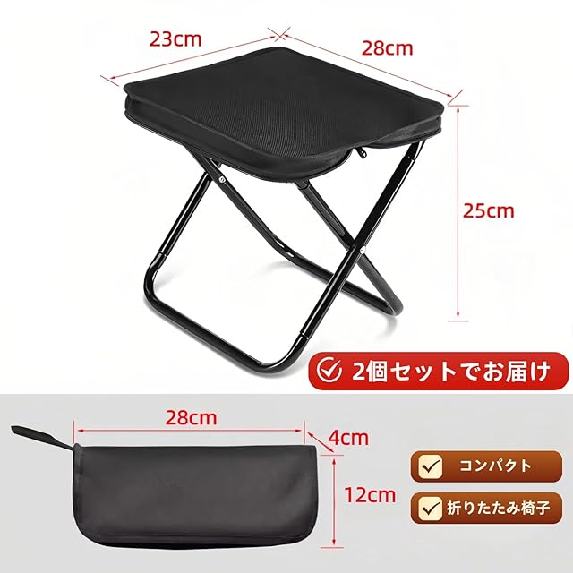 商品名:【2個入り】折りたたみ椅子 折りたたみいす 折り畳み椅子 簡易携帯いす スツール仕様 軽量 コンパクト アウトドアチェア 持ち運び便利 キャンプ バーベキュー 釣り 観戦 屋外室内兼用 収納袋一体型 キャンプ用品 (ブラック)