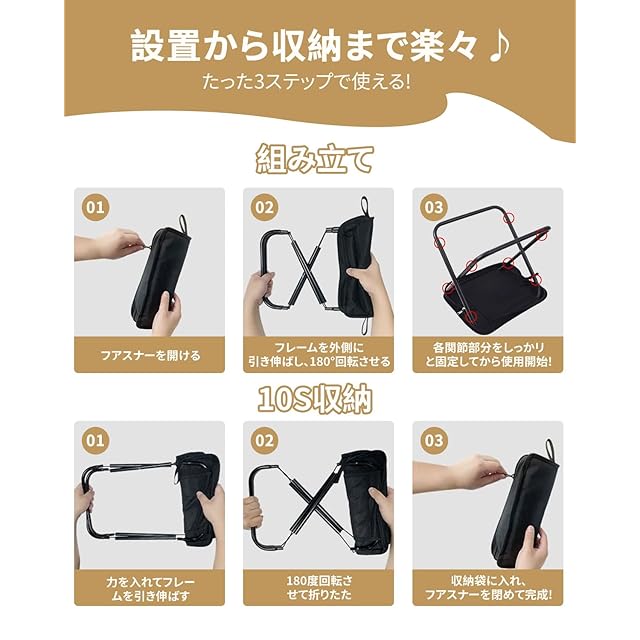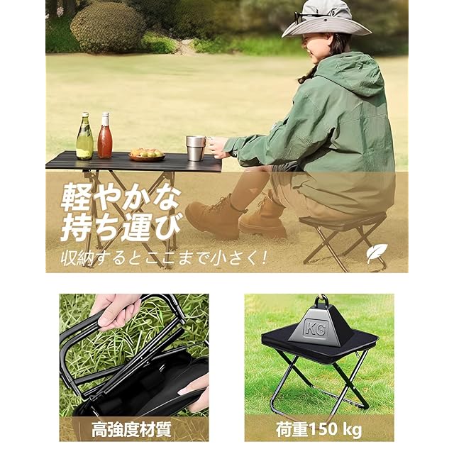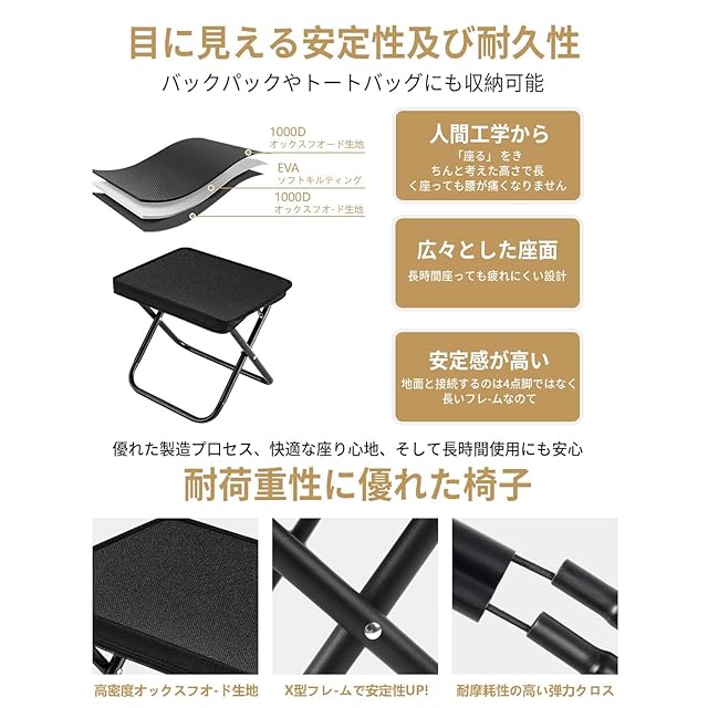 【コンパクトタイプ&安定性】僅か310gで水筒より軽いです。フレーム部分は6061アルミ素材でできており、軽いながら耐荷重は150kgに達しています。持ち手も付きますので、持ち運びに楽々、コンパクトで折りたたみ傘のように使えて便利です。座面は1000Dの厚手で丈夫な生地を使い、張りのある安定した座り心地と耐久性を兼ね備えました。また採用のオックスフォード生地は通気性もよく、快適に過ごすことができます。