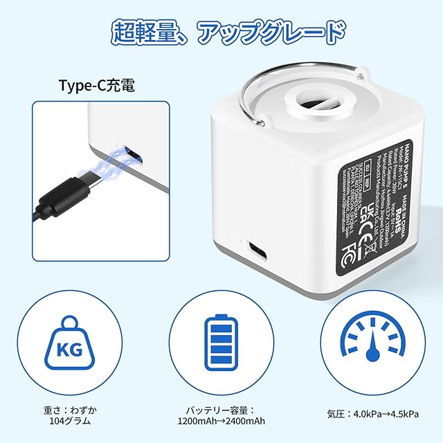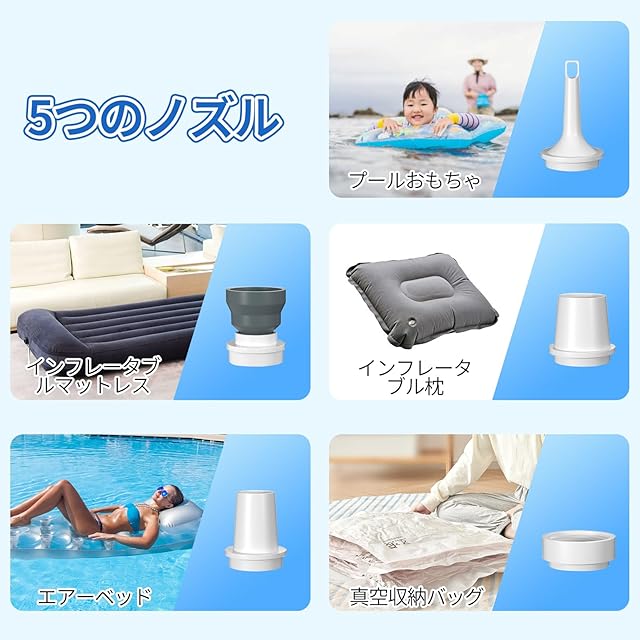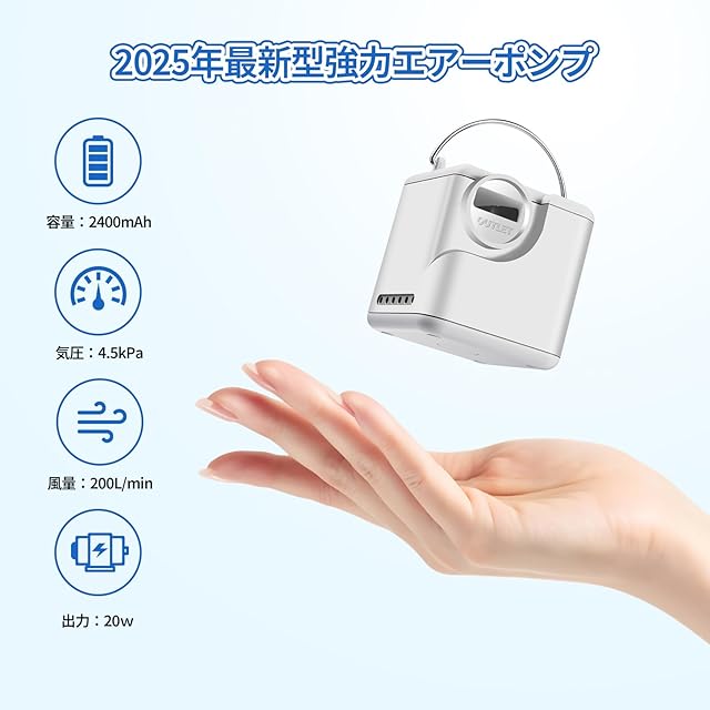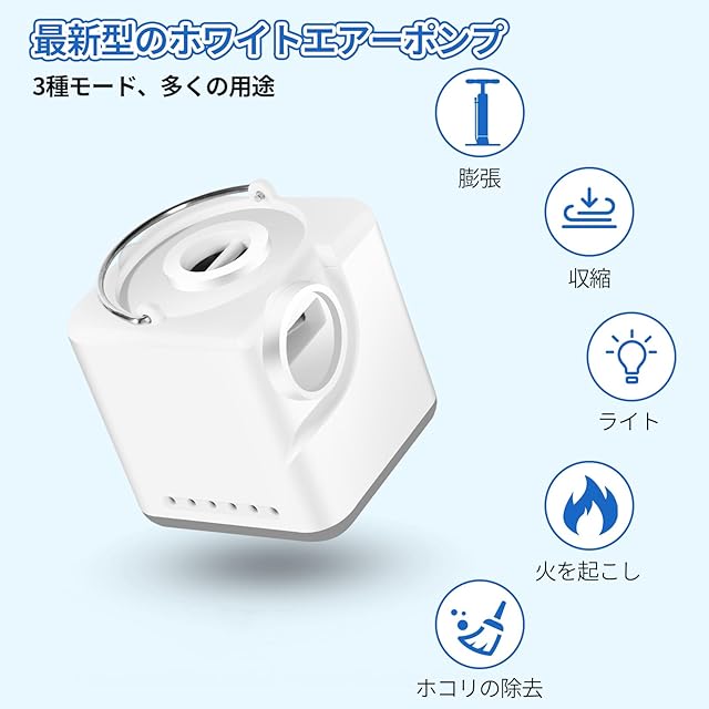 商品名:電動ポンプ 空気入れ【増圧機能・大容量バッテリー・ライト付き】電動エアーポンプ 電動 超軽量 携帯式 ミニポンプ 2400mAh大容量 強力200L/分 USB Type-C充電式 空気入れ・空気抜き 両対応 過熱保護 5種類ノズル&収納袋付き エアマット/浮き輪/エアーベッド/エアーソファー/プール/ゴムボート/真空圧縮袋対応 キャンプ 防災 アウトドア 日本語取扱説明書付き (ホワイト)