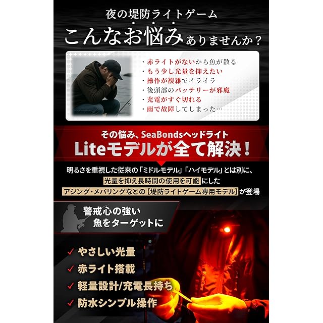 シーボンズ ヘッドライト 釣り 堤防ライトゲーム専用 最大300ルーメン IP66防水 超軽量114g アジング・メバリング・エギング対応 赤色LED搭載 タイプC充電式 保護回路基板付き2200mAhバッテリー