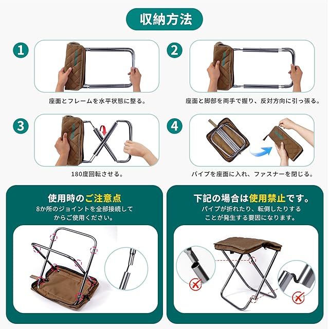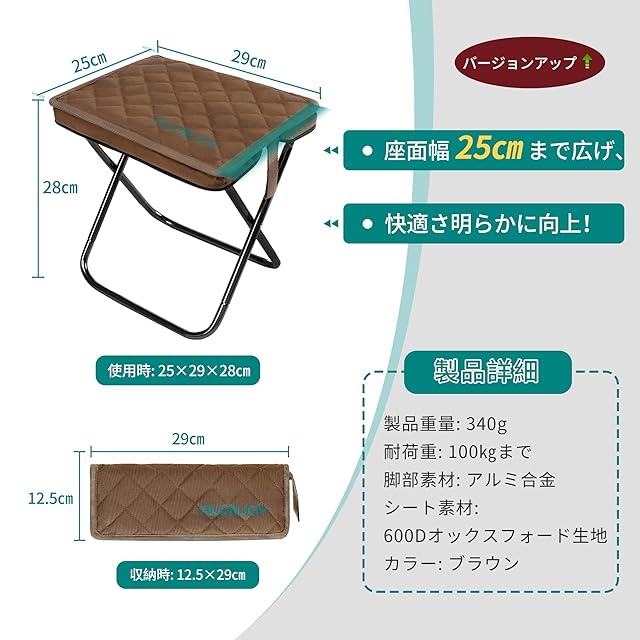 【高品質】 ①フレーム:アルミ合金のジュラルミン製頑丈さと安定性が優れる、耐荷重は100㎏まで! ★ただ、ストンと一気に座ると衝撃荷重が大きくなり、繋ぎ目が折れたりする原因にもなります。 ②座面:600Dのオックスフォード生地、破れにくい、通気性もあり。 裏側に全面的に補強付き、それにクッション材充填の2層構造で座り心地もより快適!