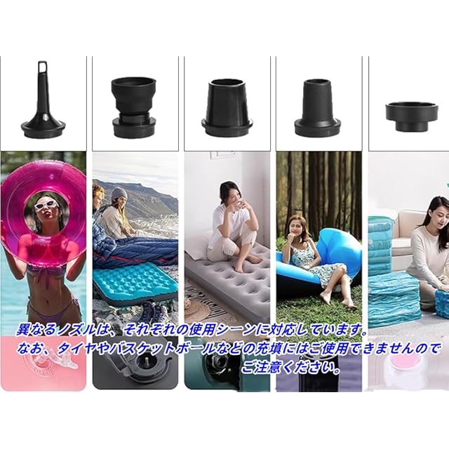 【多用途対応!5種類のノズルで便利に使える】 付属の5種類のノズルを使うことで、エアベッド、インフレーターマット、BBQの送風、浮き輪など、あらゆるシーンで活躍します。キャンプやビーチでの利用にも便利で、ノズルの組み合わせで多彩な用途に対応。※製品によっては、ノズルがしっかりとハマらない場合がありますが、その場合は手で軽く押さえながらご使用いただけます。