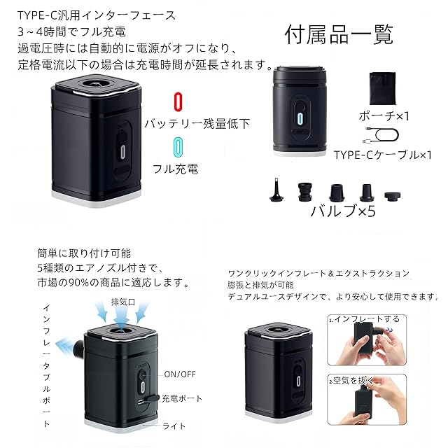 商品名:エアーポンプ 電動 空気入れ・空気抜き対応 USB充電式 超軽量 コンパクト設計 5種類ノズル付き 多用途ポンプ 浮き輪/ゴムボート/エアベッド/真空袋対応 LEDライト搭載