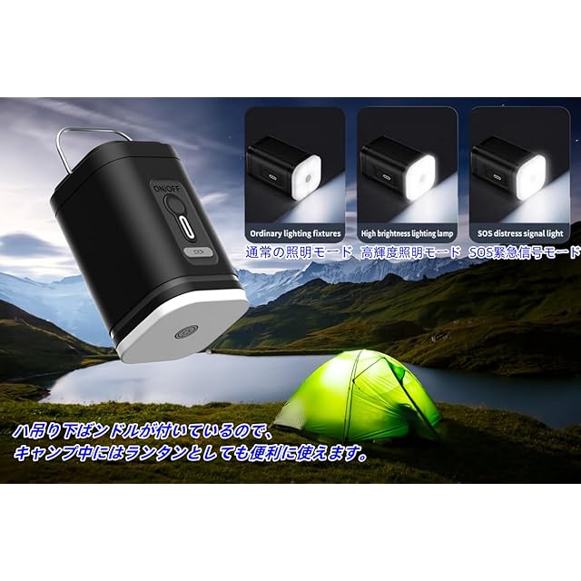 【3段階調整可能なLEDライト機能】 LEDライトは3段階で明るさを調整可能。キャンプの夜間にも最適で、ボタン一つで点滅する信号モードや、非常時にも役立つSOSモードを搭載。吊り下げフックを使えば、車やテントなど、さまざまな場所にライトを取り付けて便利に使用できます。
