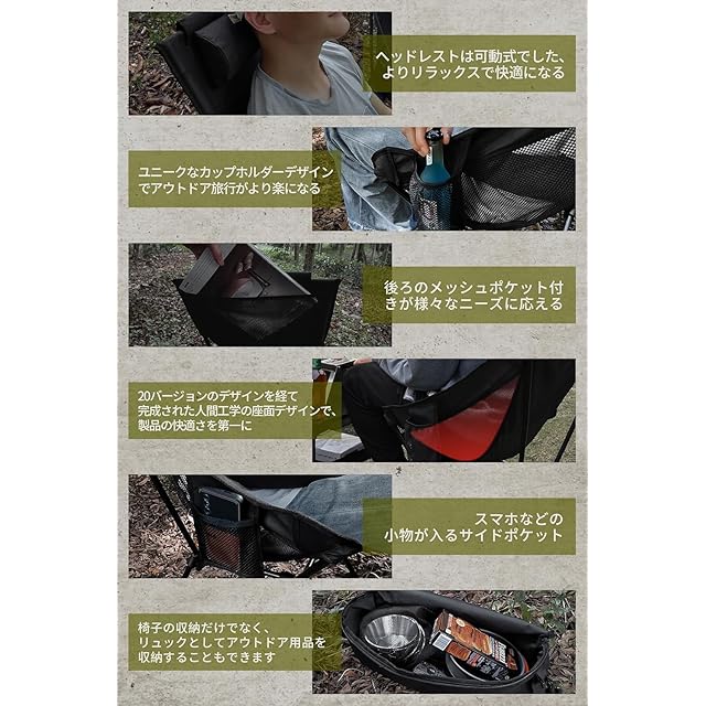 【高さ両パターンで切り替え可能】足を折り畳むや開くことによって、グランドとノーマルスタイルの両パターンで切り替え可能。焚き火に近づき暖まることや、足を伸ばすことができ、より多くのシーンで大活躍!【四角形フレームでより安定】伝統的なキャンプ椅子と違い、座面の下のフレームは四角形となっていて、全体的に安定性がアップグレード!
