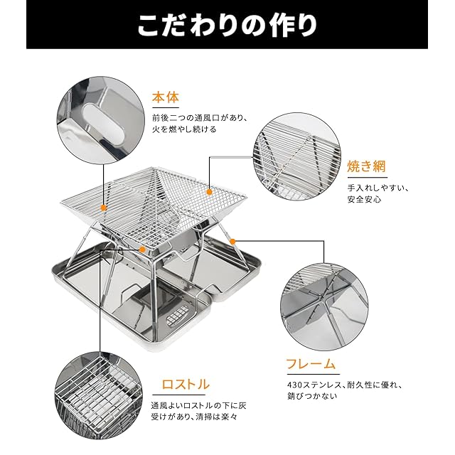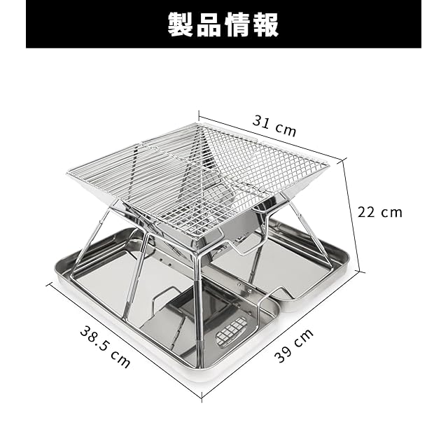 ★【仕様】 サイズ(展開時)39*38.5*22cm (収納時)41*21*7cm 焼き面積:30*30cm 重量:2.5kg 材質:本体/フレーム:430ステンレス 焼き網:201ステンレス