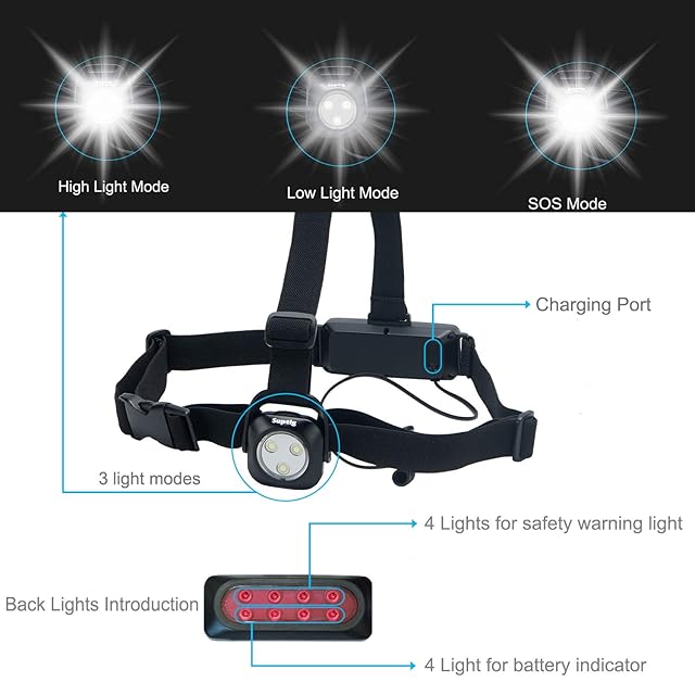 Suptigランニングライト、チェストライト、キャンプ、ハイキング、ランニング、ジョギング、ウォーキング、アウトドアアドベンチャー用ランニングベルトライトIP64防水内蔵2600mAh充電式リチウム電池(ブラック)
