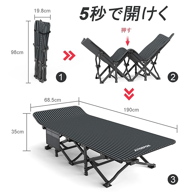 商品名:ATORPOK 簡易ベッド コット 折り畳み式ベッド 折りたたみベッド こっと アウトドアベッド 耐荷重200kg キャンプベッド キャンプベッド 防水 通気性 軽量 収納便利