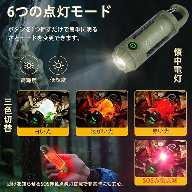 【2025新発売&多機能万能性抜群】従来の電池交換のランタンと異なり、当社のLEDランタンは業界初の6種類の照明モードを備えたランタンです。懐中電灯モード+ライトモード+SOS赤点滅モードを組み合わせた多機能LEDランタンで、ボタンを押すだけで簡単に明るさやモードを変更できるため、初めてご使用になる方でも迷わずにお使いいただけます。お好みや状況に応じて、異なる色のライトを切り替えることができます。キャンプだけでなく、懐中電灯としても使用でき、遠距離照明を提供し、複雑なアウトドア環境での使用に適しています。緊急時にはSOS信号を送信することも可能です。このランタンがあれば、アウトドア活動や災害時にも安心してご利用いただけます!6つの点灯モード:①懐中電灯モード2段階の明るさ調節(高輝度、低輝度)②ライトモード3種のライト調節(白い光、暖かい光、赤い光)③SOS赤点滅モード。ランプはどこに置いても全体を照らせる、使いやすい360度タイプです。