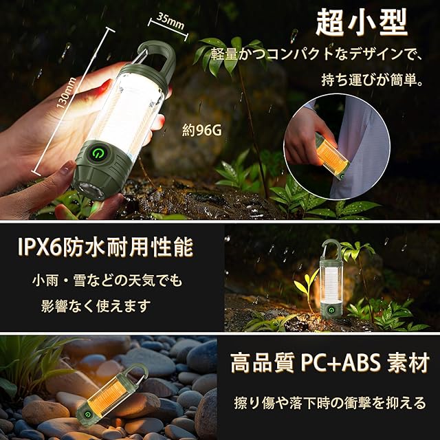 【耐用性抜群&IPX6防水性能】このLEDランタンは、高品質のABS+PC高透過カバー材料を使用しており、耐衝撃性、耐熱性、耐摩耗性を備えています。さらに、IPX6防水防塵性能を備えており、一般的な雨水や塵から保護されます。屋外環境の変化を気にする必要がなく、雨や雪などの天候に影響されずにご使用いただけます。アウトドア愛好家向けの本格的なマルチライトです!