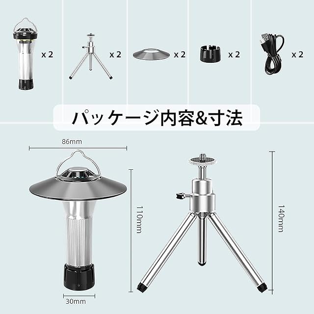 パッケージの中身:キャンプランプ本体 x 2、ランプシェード x 2、三脚 x 2、マグネットベースは x 2、USB充電ケーブル x 2
