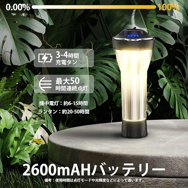 4つ点灯モード/無段階調光:懐中電灯、点滅する懐中電灯、暖かい光ランタン、赤SOSライト、長押しで調光可能です180-370 ルーメン。LEDランタンは2600 mAhバッテリーで、点灯効率が良く、懐中電灯:約6-15 時間 ランタン:約20-50 時間