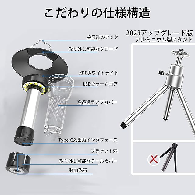 多機能組み合方法:キャンプランプ本体、ランプシェード、金属三脚、マグネットベースは、USB充電ケーブル。さまざまな使用シーンに合わせて自由に組み合わせて使用できます。懐中電灯のように一点を照らすトーチ機能があり、緊急時にいつでも使用可能。単体ではペンダントライトや小型蛍光灯として使用でき、上部のフックを使って棚やリュックなどに吊るすことができます。マグネットベースは、あらゆる鉄の物体に柔軟に取り付けられ、様々な角度で固定することができます
