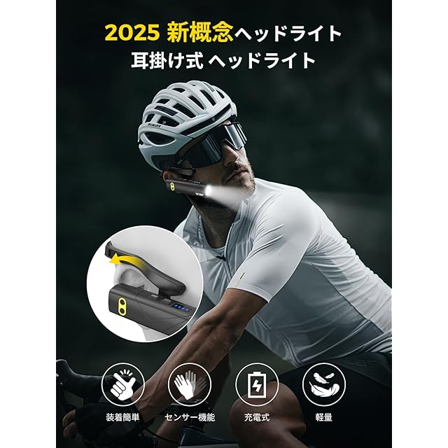 【業界始の耳装着式デザイン】新しい概念「耳掛け式ヘッドライト」を提案します。耳にかけることだけで、ヘッドライトを使用できます。超軽量で耳に負担がかかりません。便利で美観なデザインにより、どんな活動にも適しています。