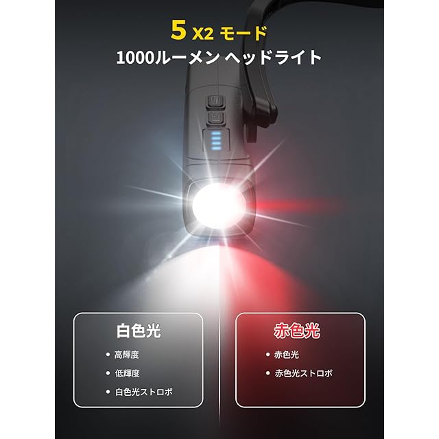 【複数の照明モード】高輝度白色光、低輝度白色光、白色光ストロボ、赤色光、赤色光ストロボという5つの照明モードがあります。高輝度ヘッドライトは1000ルーメンに達し、様々な照明ニーズに対応できます。